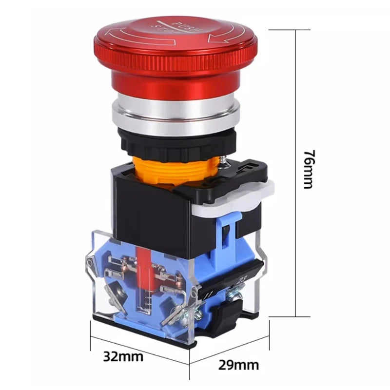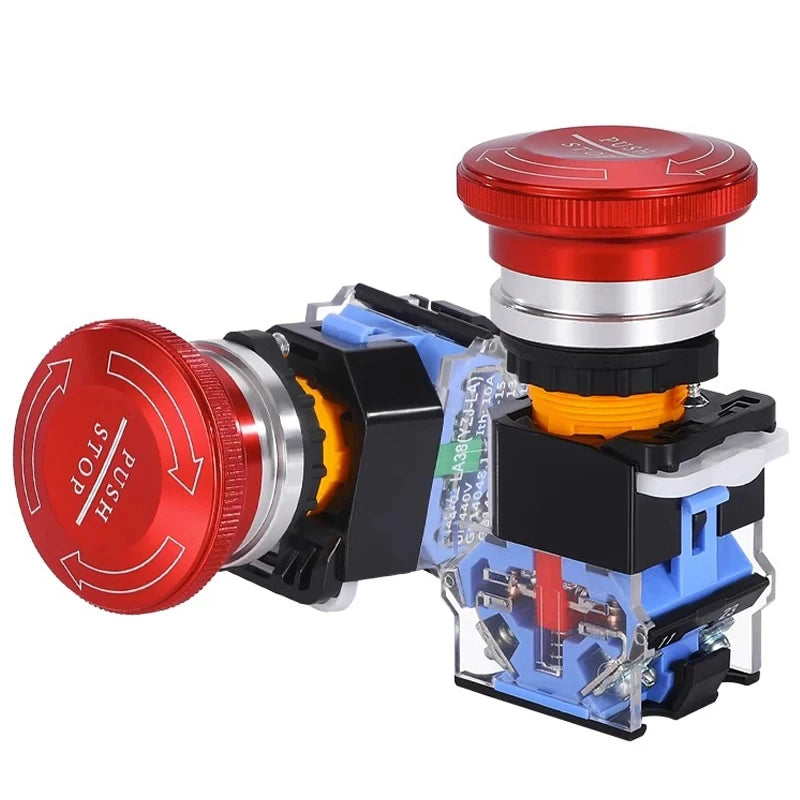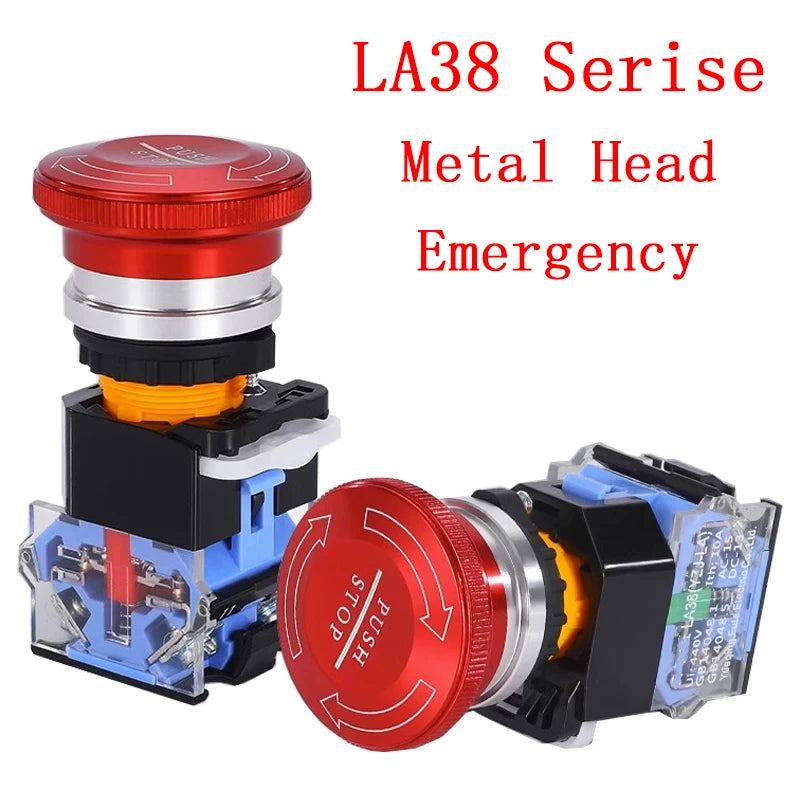 El interruptor de botón de parada de emergencia a prueba de agua LA38 de 22mm cuenta con una clasificación de 10A y un botón de perilla de auto-bloqueo, hecho de metal duradero, acero inoxidable, aluminio y plástico.