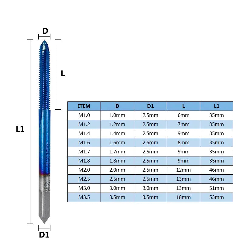 Taille des tarauds : M1 M1.2 M1.4 M1.6 M1.7 M1.8 M2 M2.5 M3 M3.5