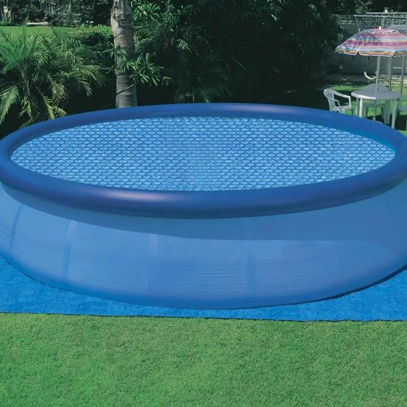 This solar pool cover is made of PE bubble film, effectively reducing water evaporation, retaining heat, and extending the swimming season. The blue design absorbs sunlight while preventing debris from entering the pool, keeping the water clean.