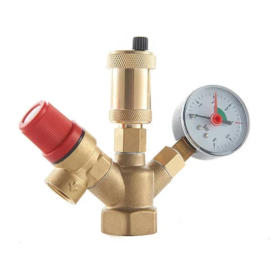 Il set di valvole di sicurezza standard per caldaie include una valvola di sicurezza in ottone con manometro per una misurazione accurata della pressione, garantendo un funzionamento sicuro e affidabile della caldaia.