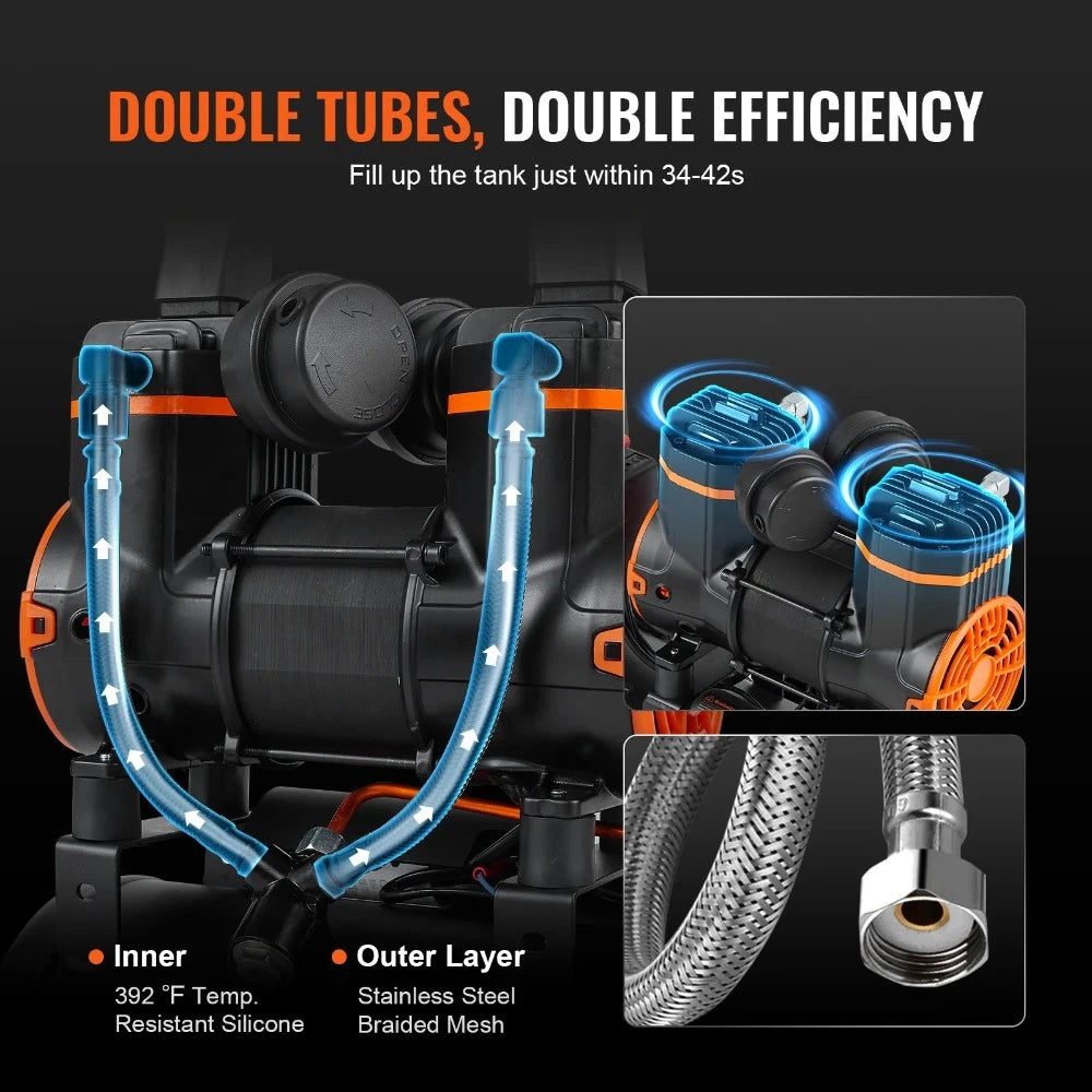 Szybkie i wydajne pompowanie: Nasz bezolejowy kompresor powietrza przyjmuje podwójne rury i podwójny cylinder przy wlocie jednocześnie, skutecznie oszczędzając czas i wysiłek. Rura wlotowa jest wykonana z odpornego na wysoką temperaturę silikonu i stalowej plecionki, zapewniając podwójną ochronę przed uszkodzeniami i korozją.