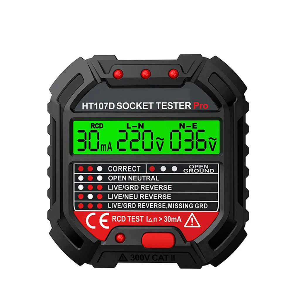 HT107D Socket Tester Digital Plug AC Voltage Detect RCD Test Socket Detector EU Plug Ground Zero Line Plug Polarity Phase Check