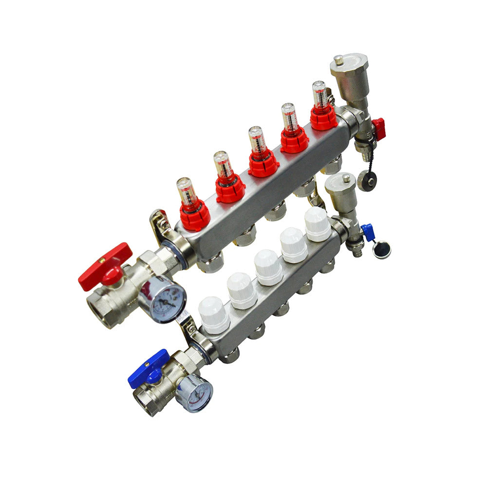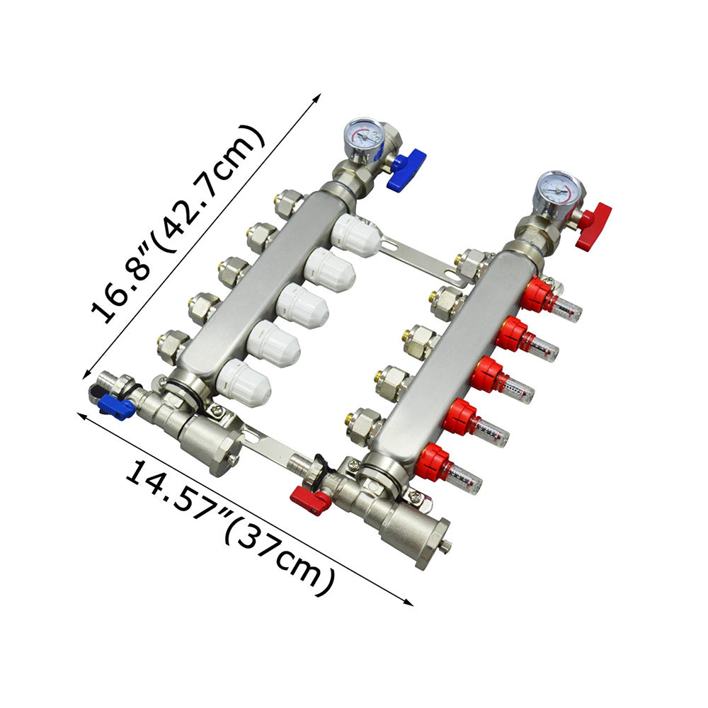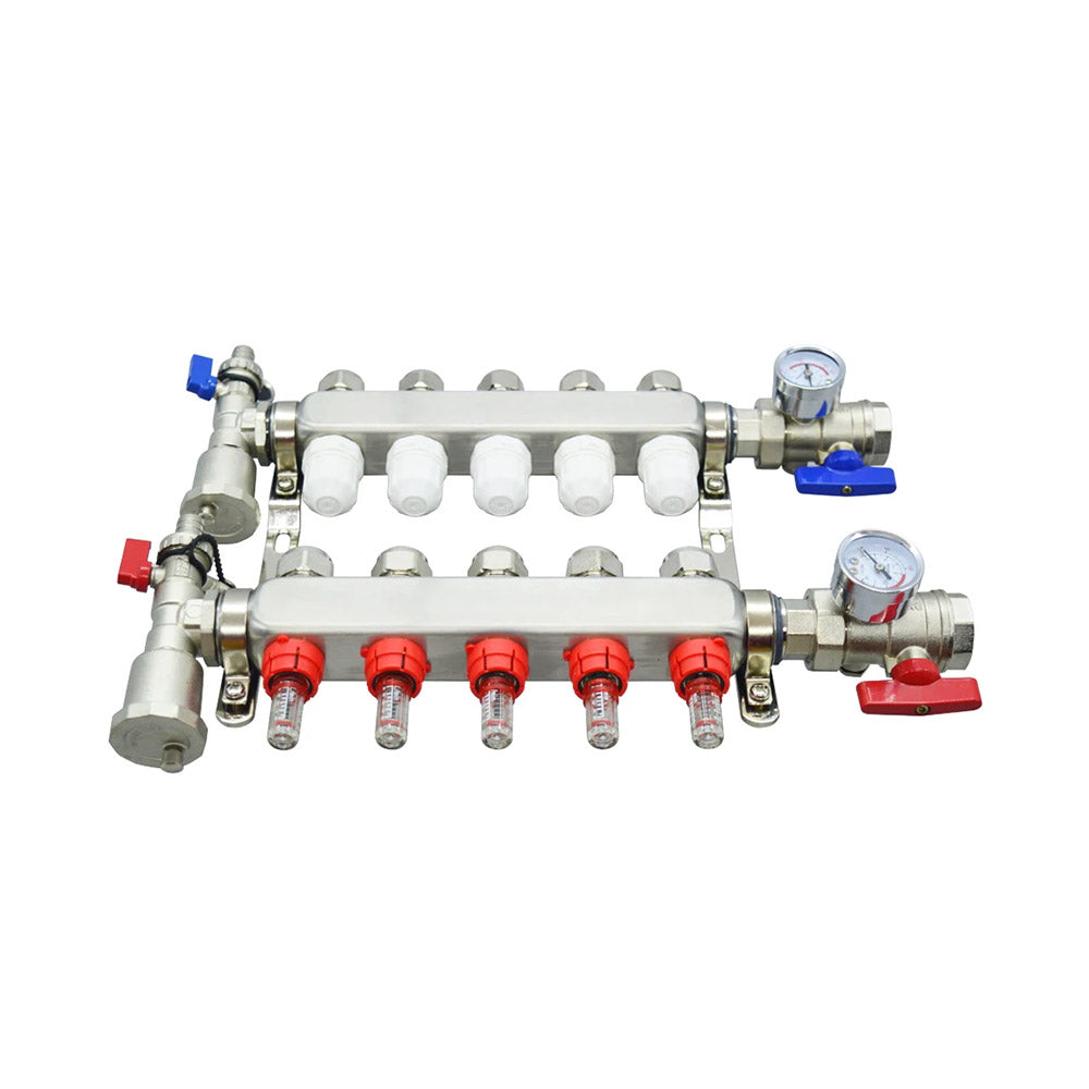 Stainless Steel Radiant Floor Heating Set (1/2" Floor Manifold with Flow Meters 2-12 Loop Configuration (5 Branches)