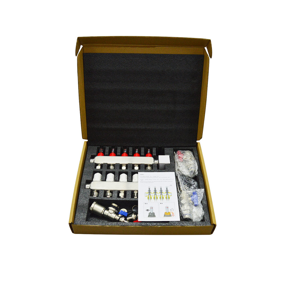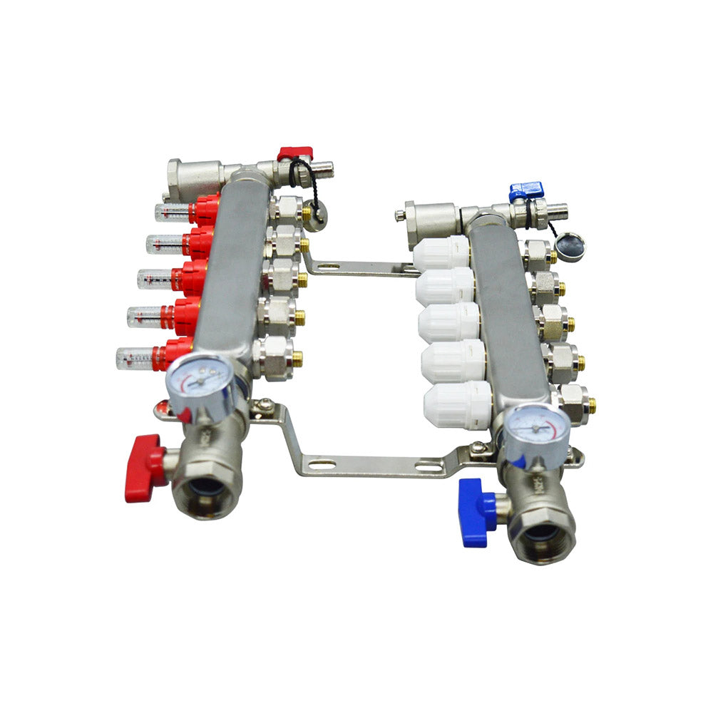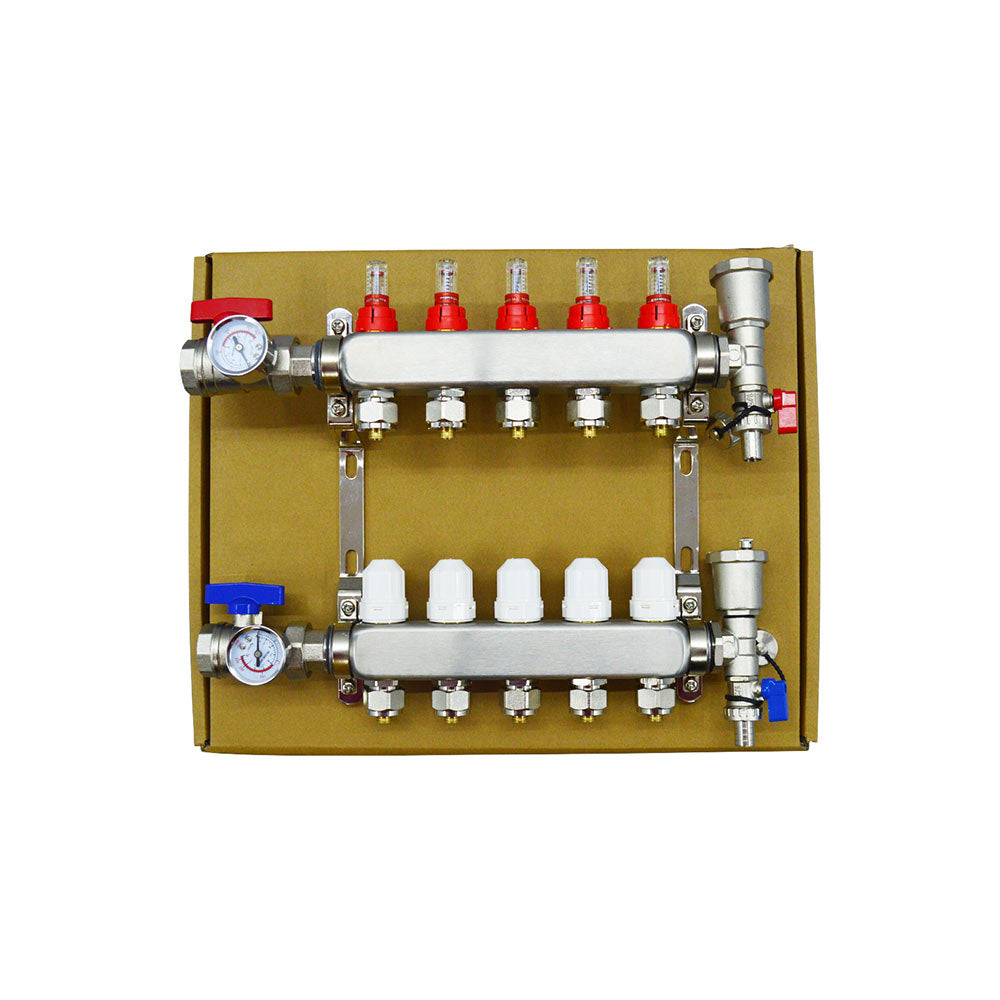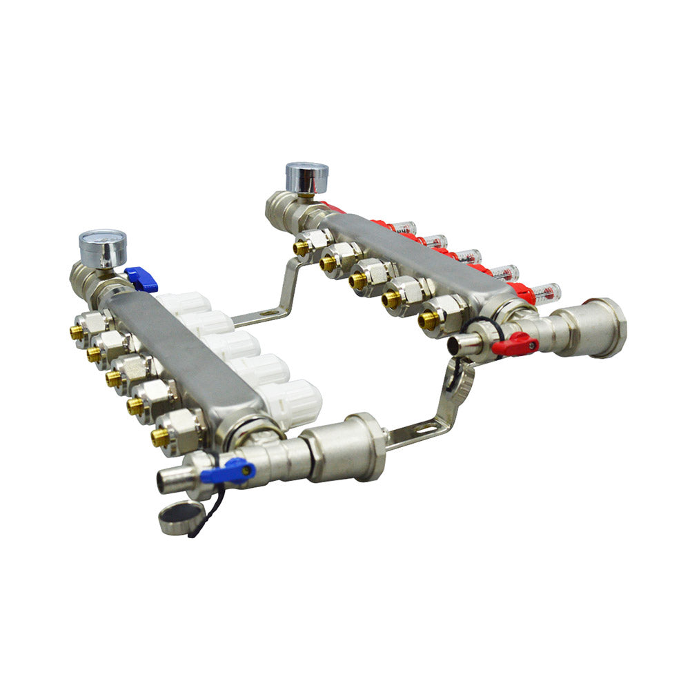 Stainless Steel Radiant Floor Heating Set (1/2" Floor Manifold with Flow Meters 2-12 Loop Configuration (5 Branches)