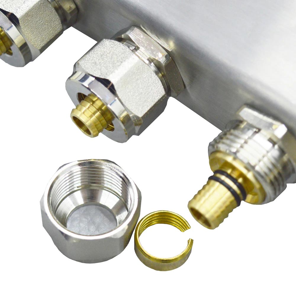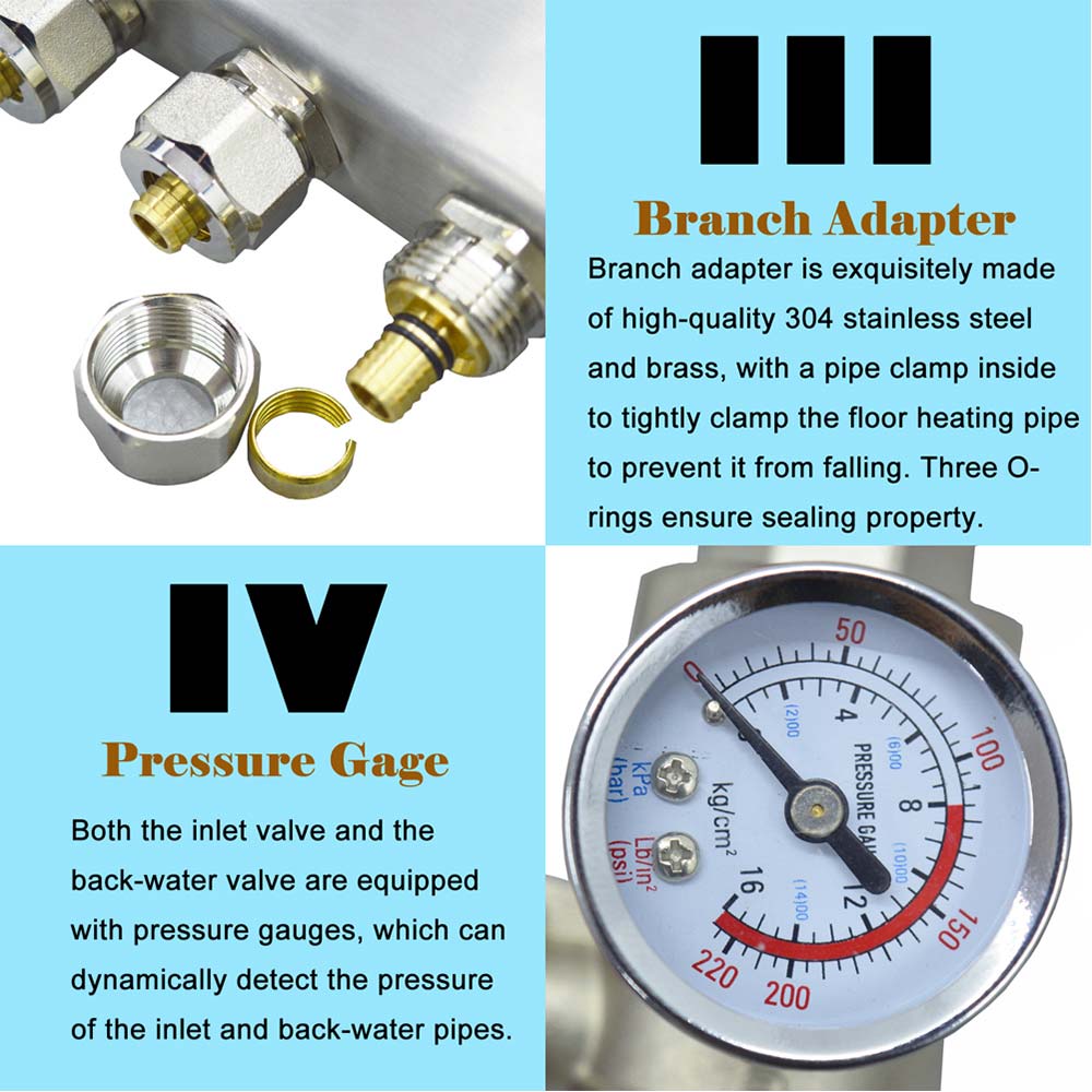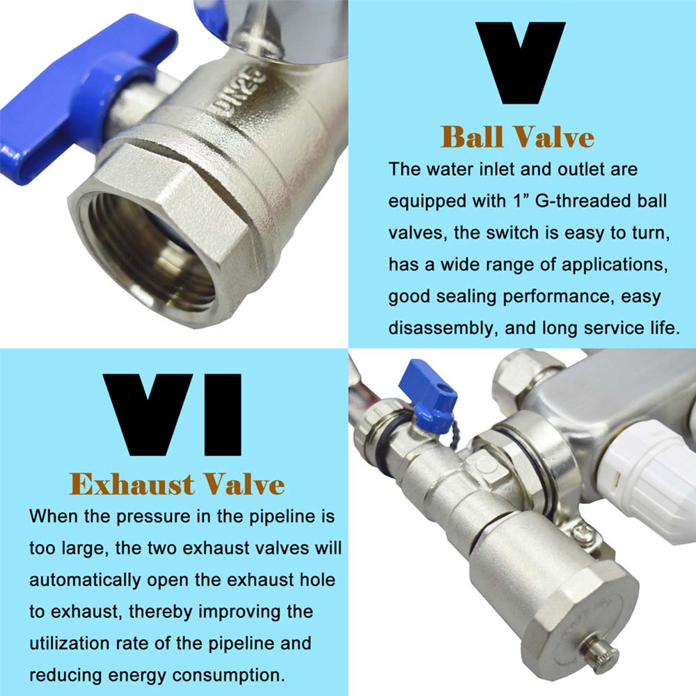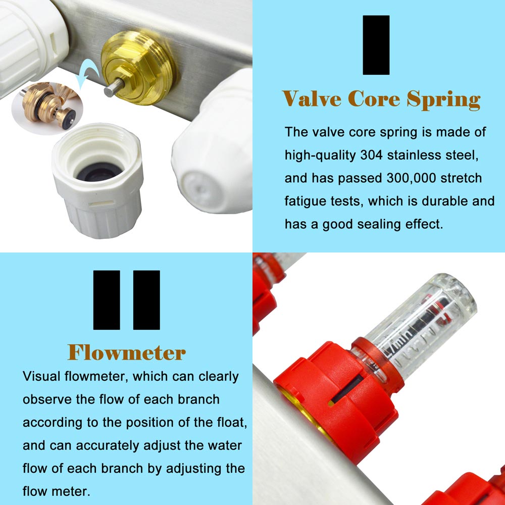 In the floor heating system, the manifold is mainly responsible for the opening and closing of the water flow in the floor heating loop. When the heated water flows into the manifold through the main pipeline, the water is evenly distributed to the loop, and after heat exchange, the water is returned to the water outlet. Into the heating system.