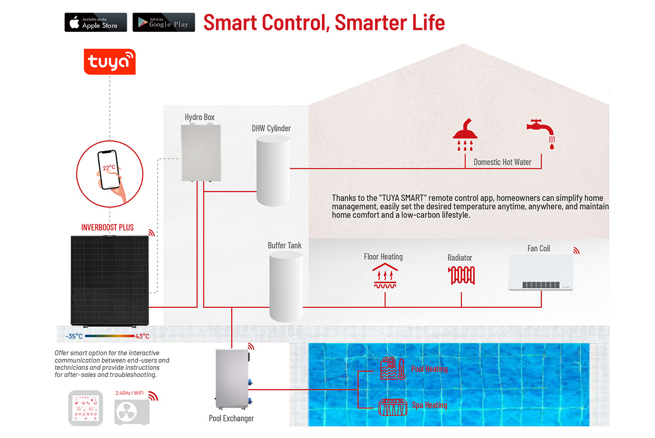 INVERBOOST PLUS Air to WaterHeat Pumps utilize the latest INVERBOOST adaptive full inverter technology, enabling the compressor to operate with optimal energy consumption for highly efficient heating. Under the same conditions, operating in a 30-square-meter room can save 60% of energy consumption compared to gas wall-mounted boilers and 70% compared to electric wall-mounted boilers.