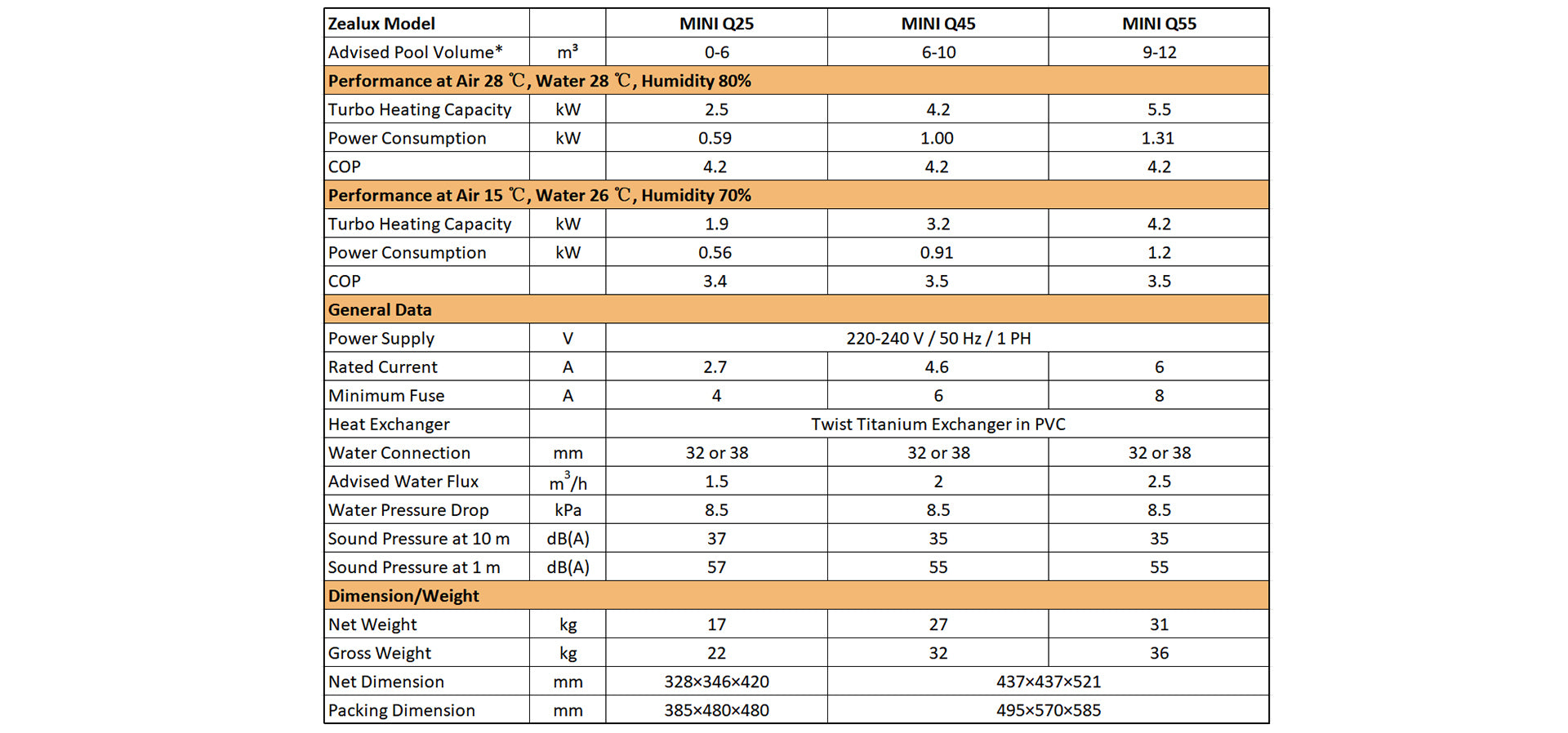 Zealux MINI Q Pool Heat Pump - 2.5kW~5.5kW for 10~20m3 pool